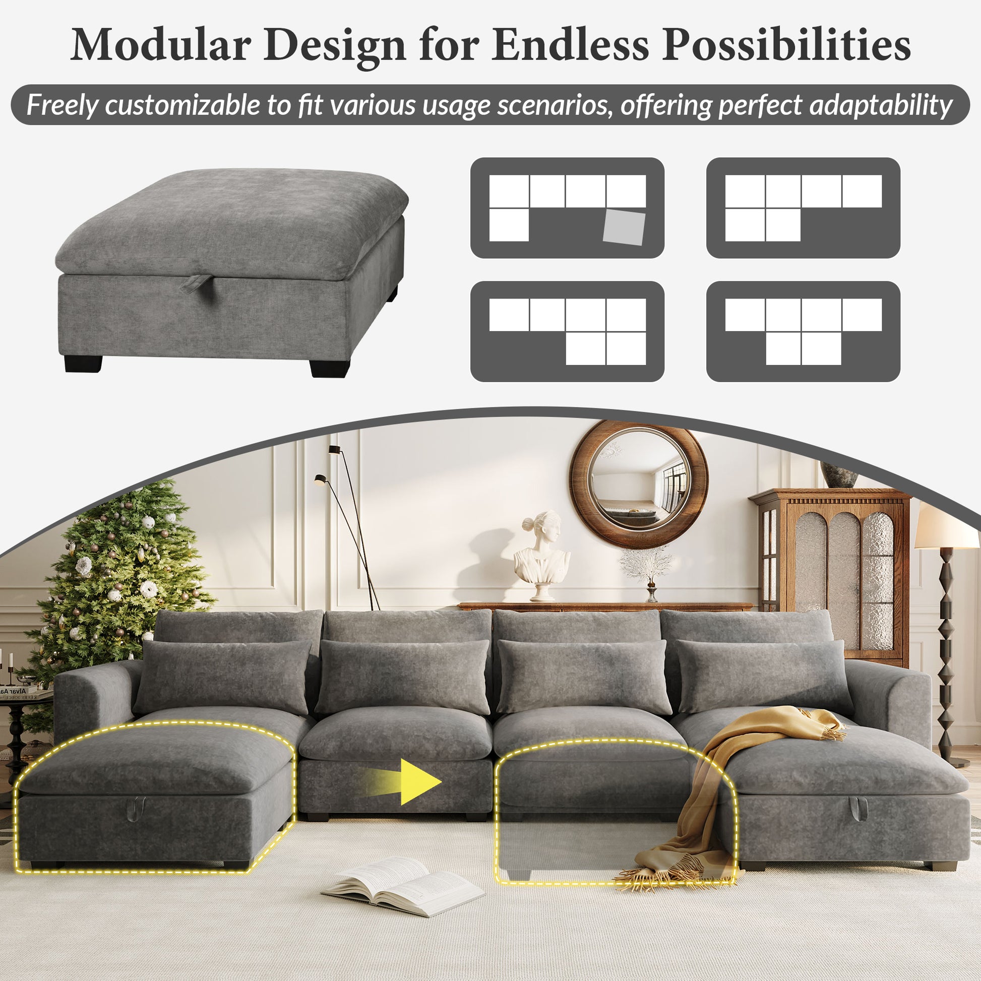 - Free Transformation,Space Under Your Control: This U-shaped modular sofa, paired with two movable ottomans, breaks the fixed mold of traditional sofas, allowing you to change the combination as you wish. Whether it's a cozy scene of sitting around chatting or a relaxing moment lounging lazily, it can be easily achieved, giving your living room more possibilities.
