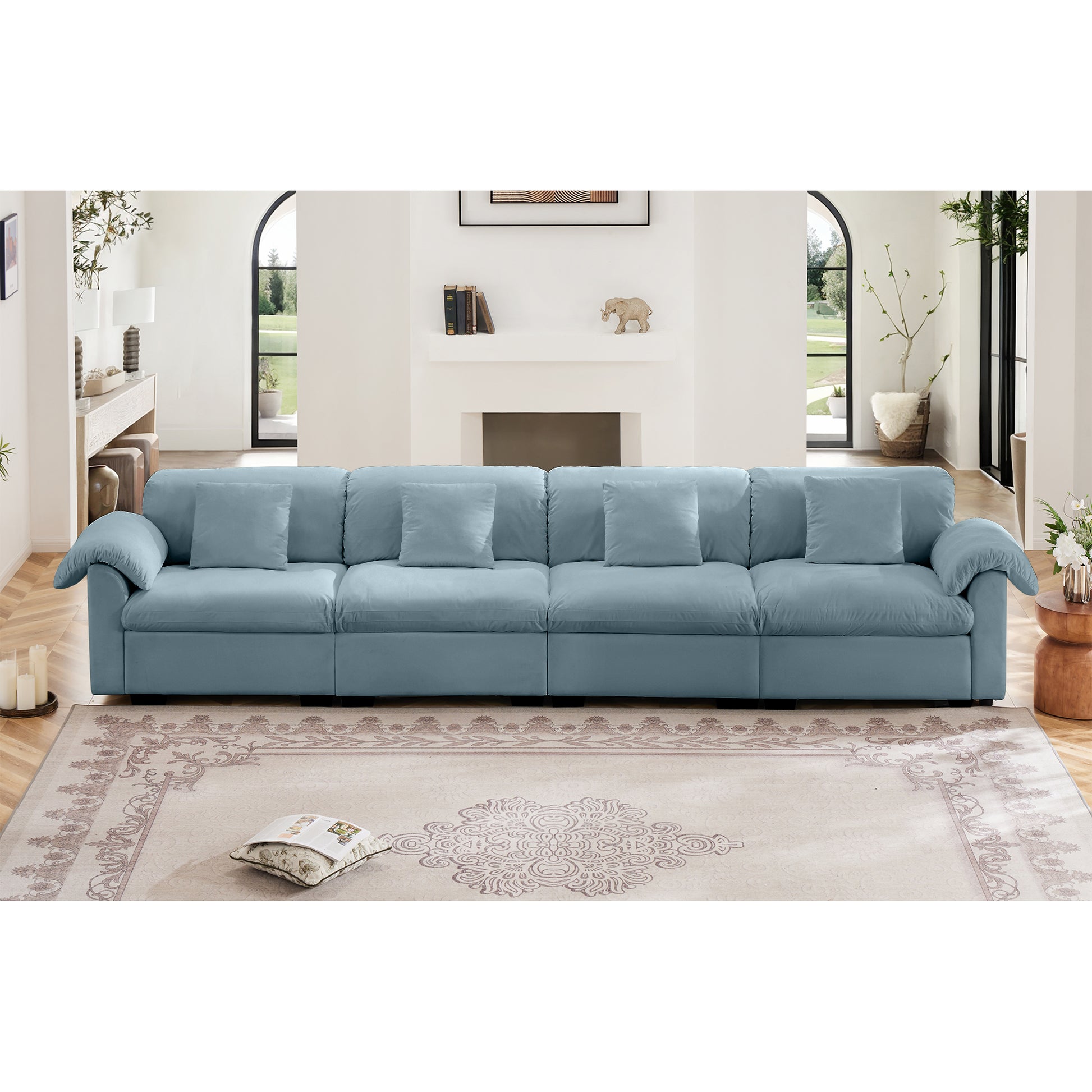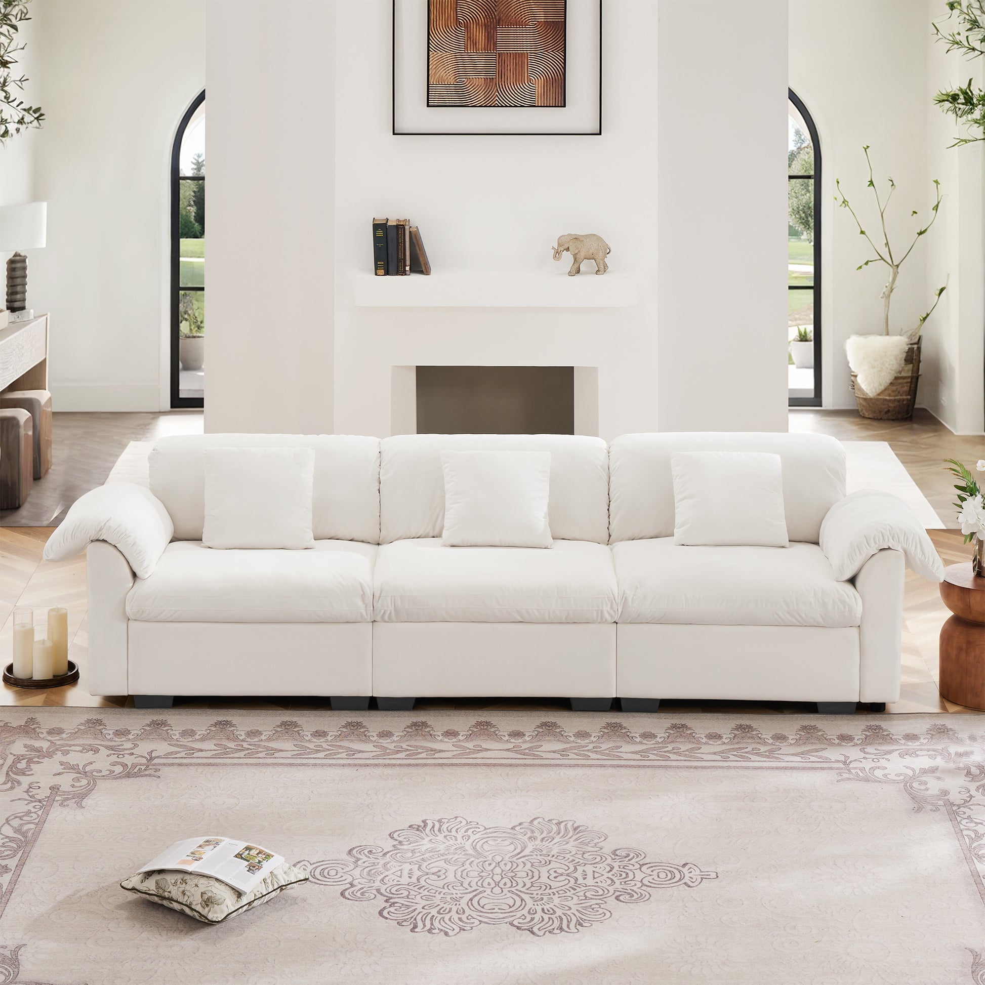 Our sofa is a visual masterpiece, featuring exquisitely beautiful velvet fabric that serves as the cornerstone of its allure. The distinct armrest and backrest design add a contemporary edge, imbuing your home with a refined, cozy, and stylish ambiance. From every vantage point, the special arm and back pillows evoke the imagery of clouds gently drifting across the sky, enhancing the sofa's charm. The rich, vibrant colors of the velvet fabric create a visually arresting effect, making it a focal point in any room.