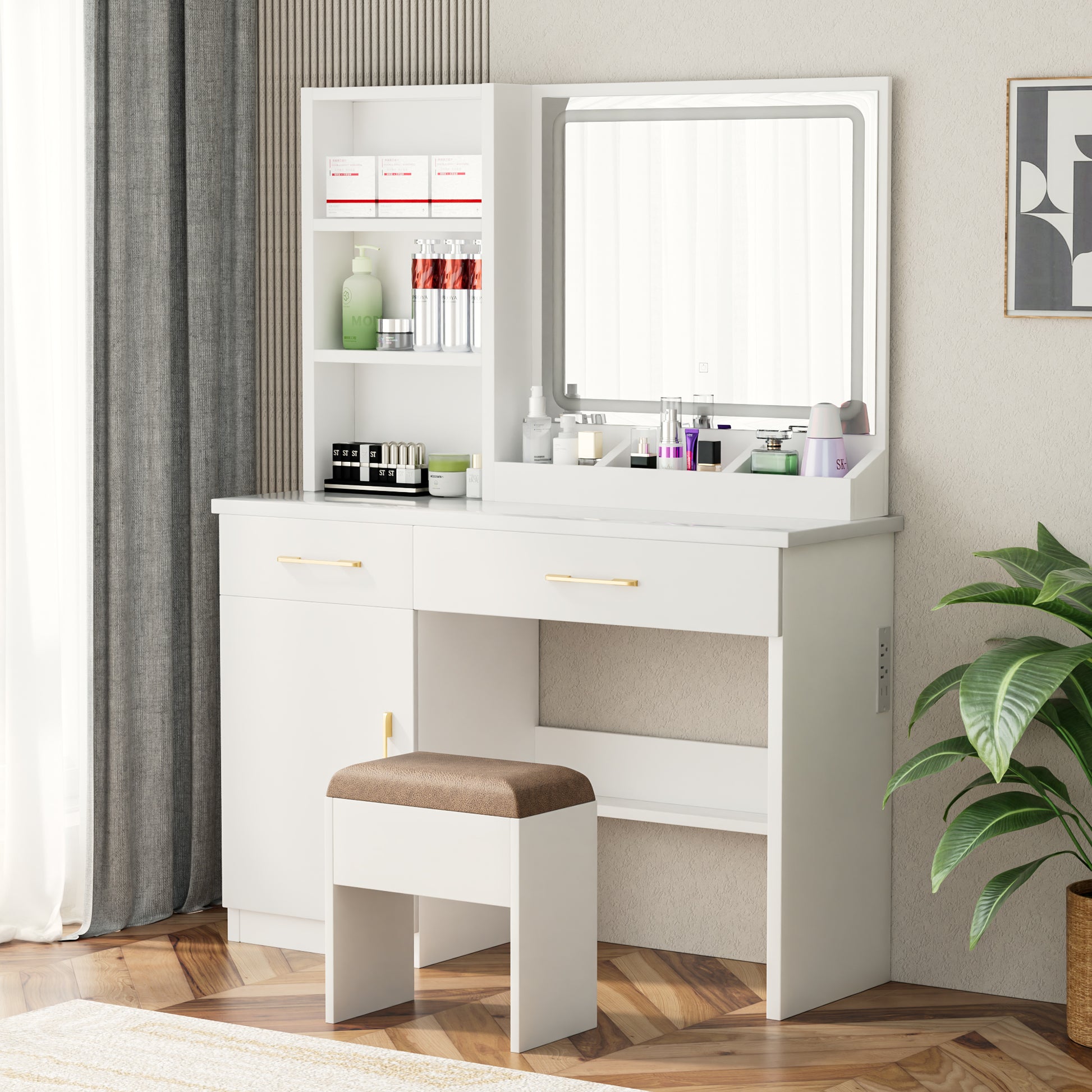 - [BUILT-IN CHARGING STATION[-Vanity desk with mirror and lights includes 2 standard electrical outlets and 2 USB ports, allowing you to conveniently connect and charge your hair tools, smartphones, tablets, and other devices.