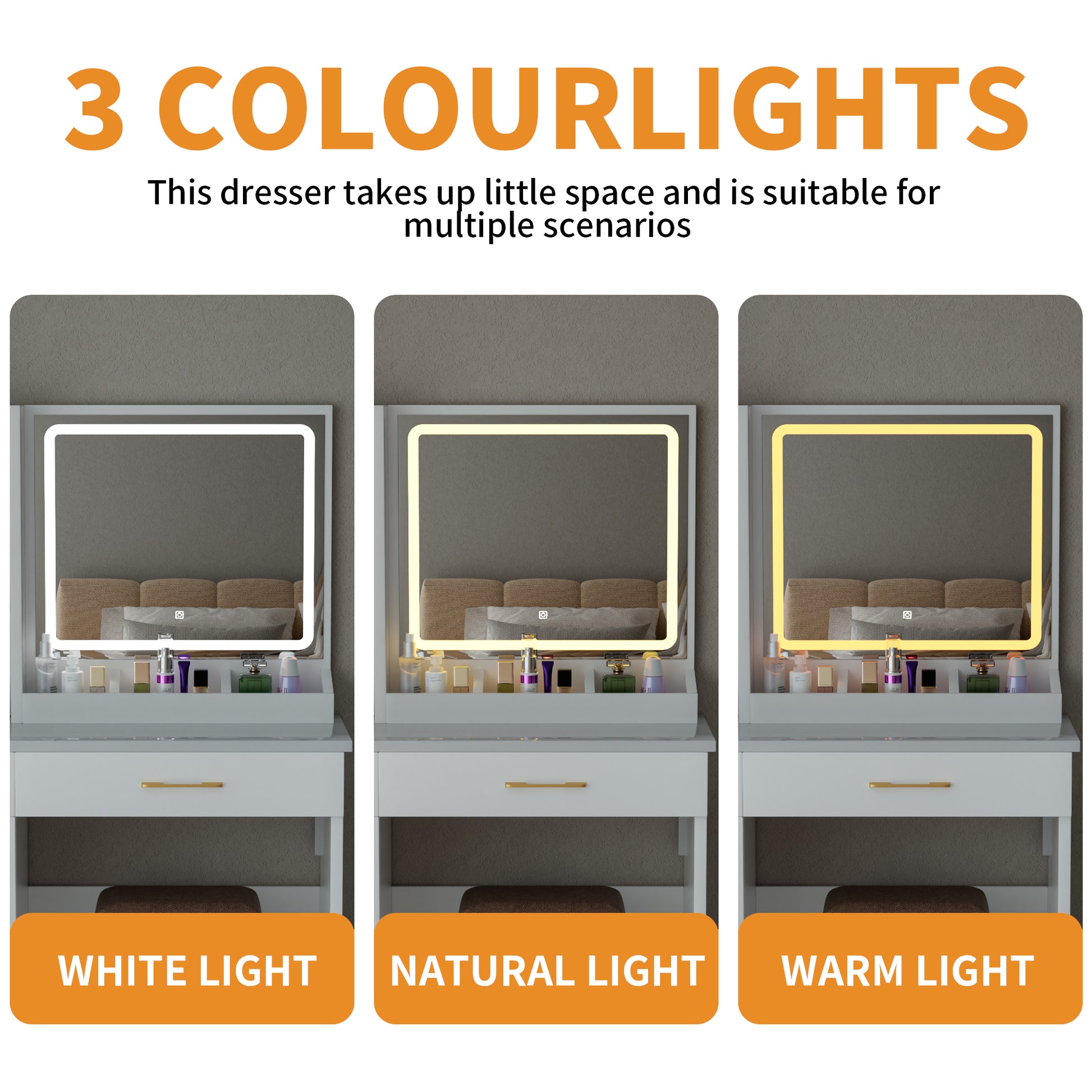 - [ADJUSTABLE LED LIGHTS]-Dresser mirrors with 3-tone adjustable lights, warm yellow, warm white, and cool white, meet your needs for different environments. A long press to adjust the brightness, and a short press to adjust the light mode. Ideal for home, work, hair salons, and studio makeup applications.