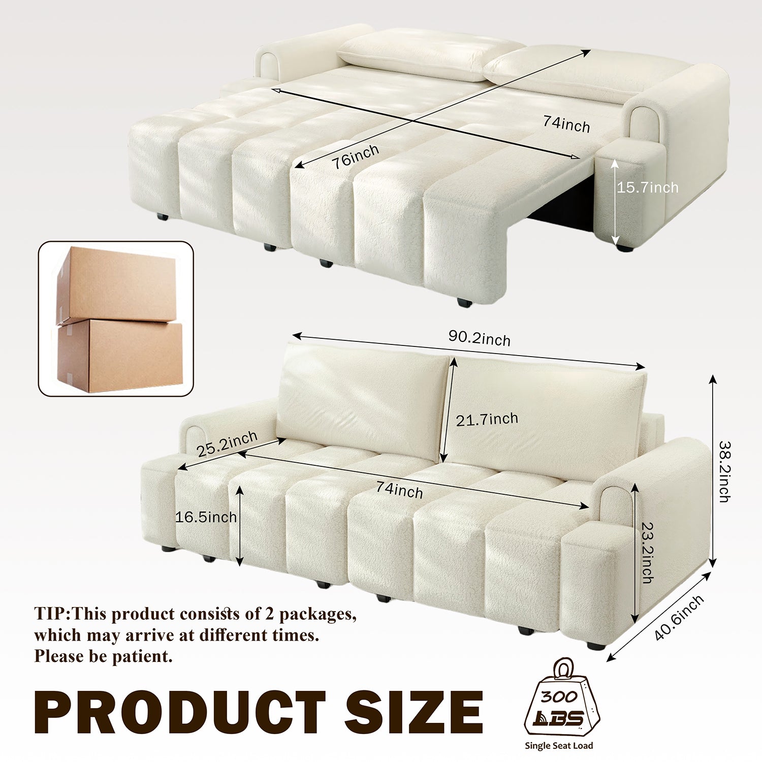 | Overall Dimension | Sofa Size: 90.2"W x 40.6"L x 38.2"H Sleeper Size: 76"W x 74"L x 15.7"H |