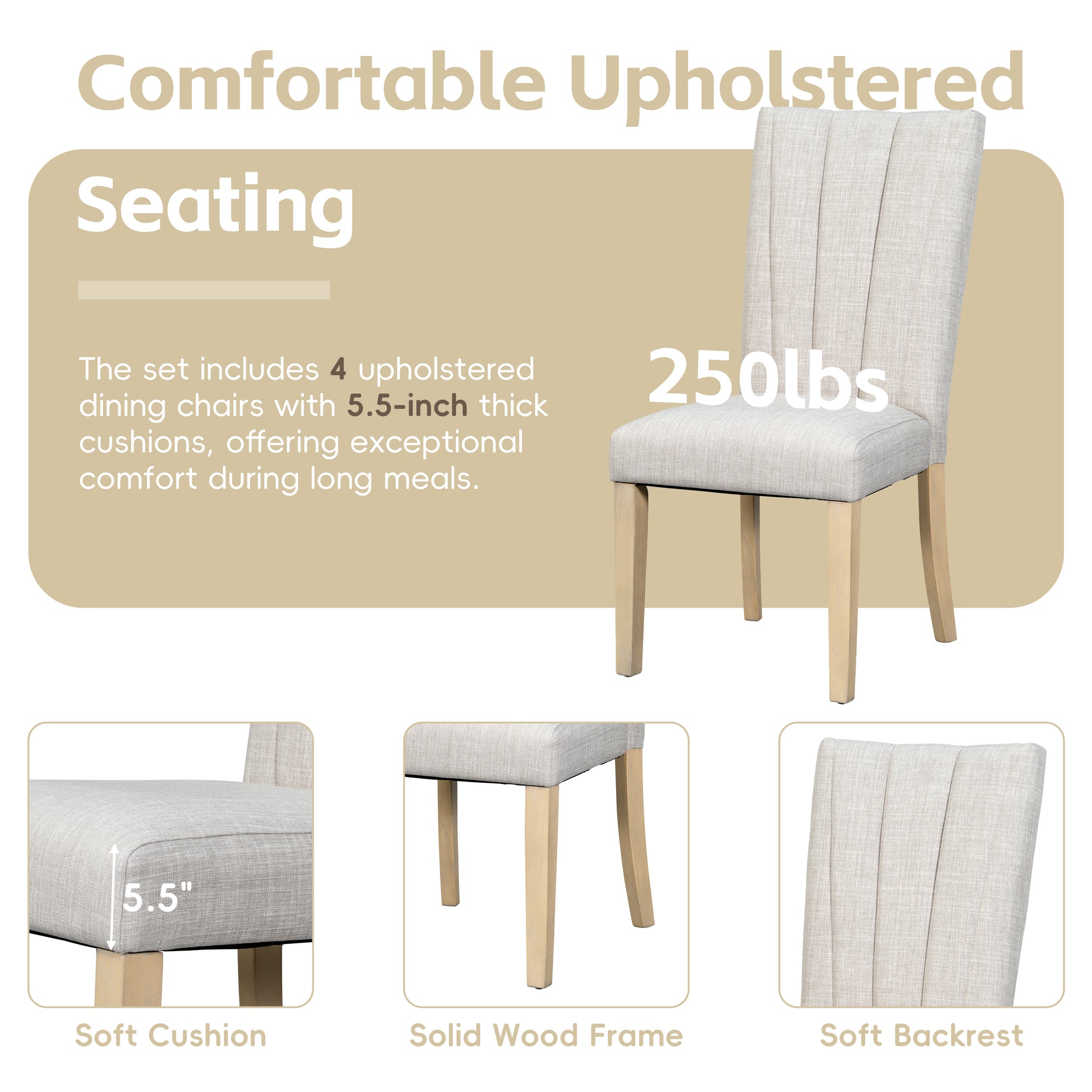 - [Comfortable Upholstered Seating] The set includes 4 upholstered dining chairs with 5.5-inch thick cushions, offering exceptional comfort during long meals. A padded 37.8-inch long bench is also included for additional flexible seating, providing ample space for guests while maintaining a cozy, inviting atmosphere.