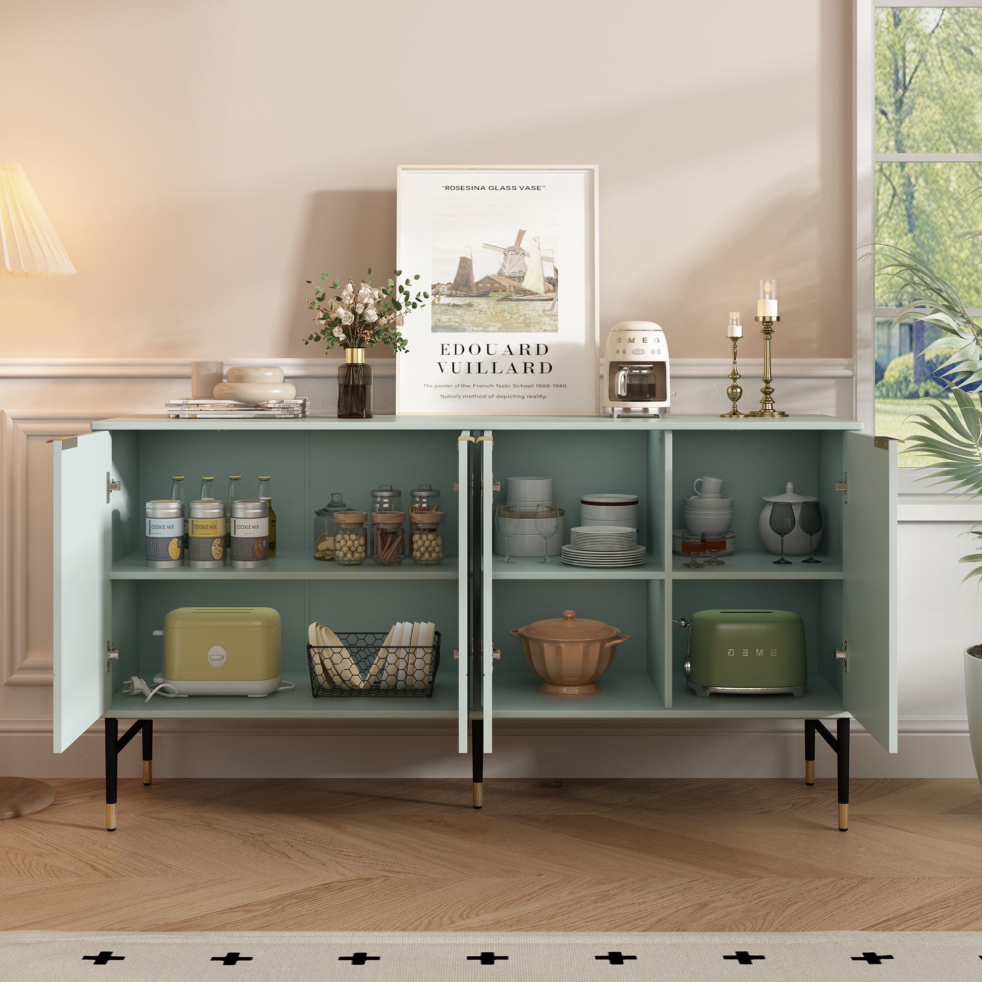 Large Storage Space: The sideboard buffet with 4 doors provides ample hidden storage for books, toys, TV, or kitchen utensils. A spacious table top is available for decorative items and essential items.
