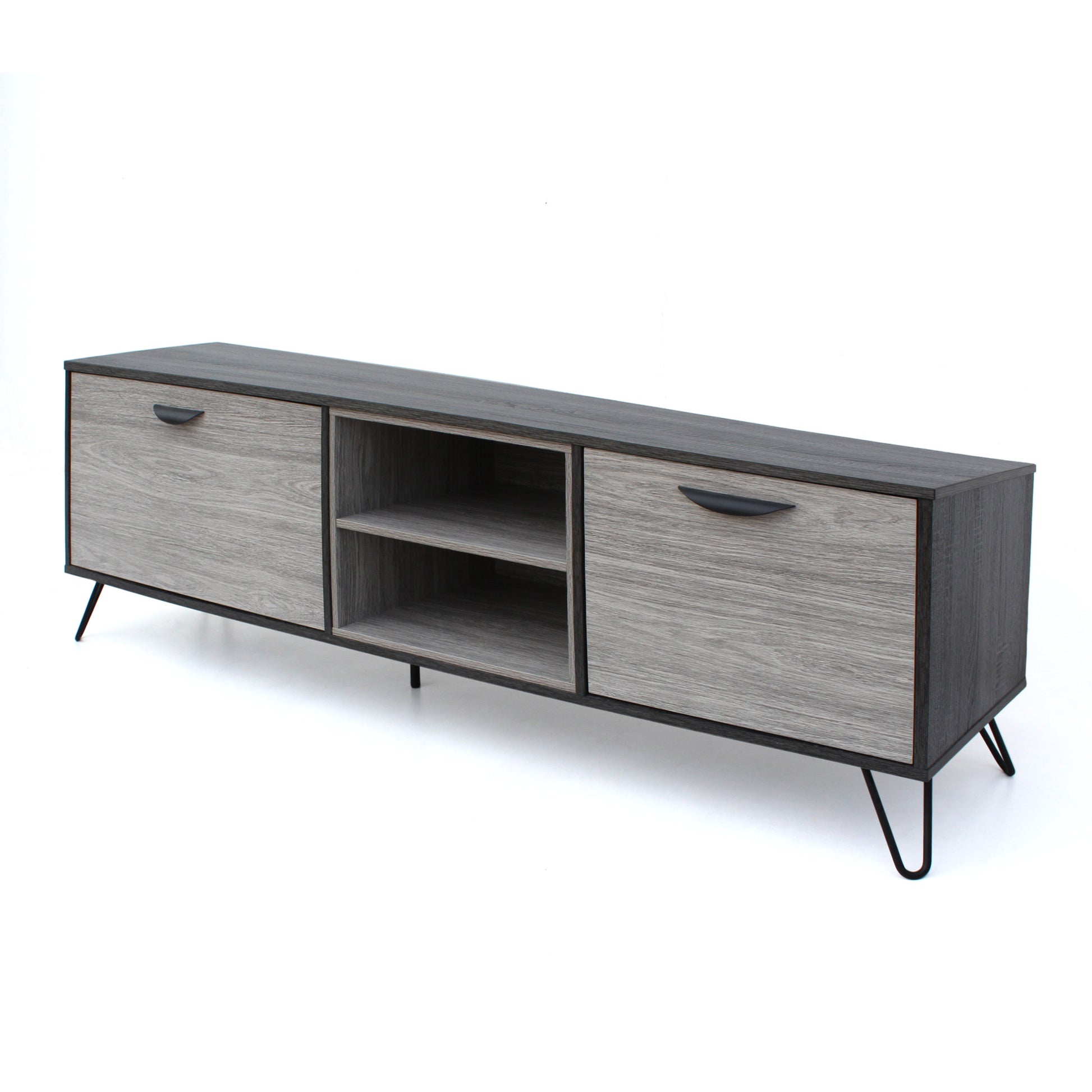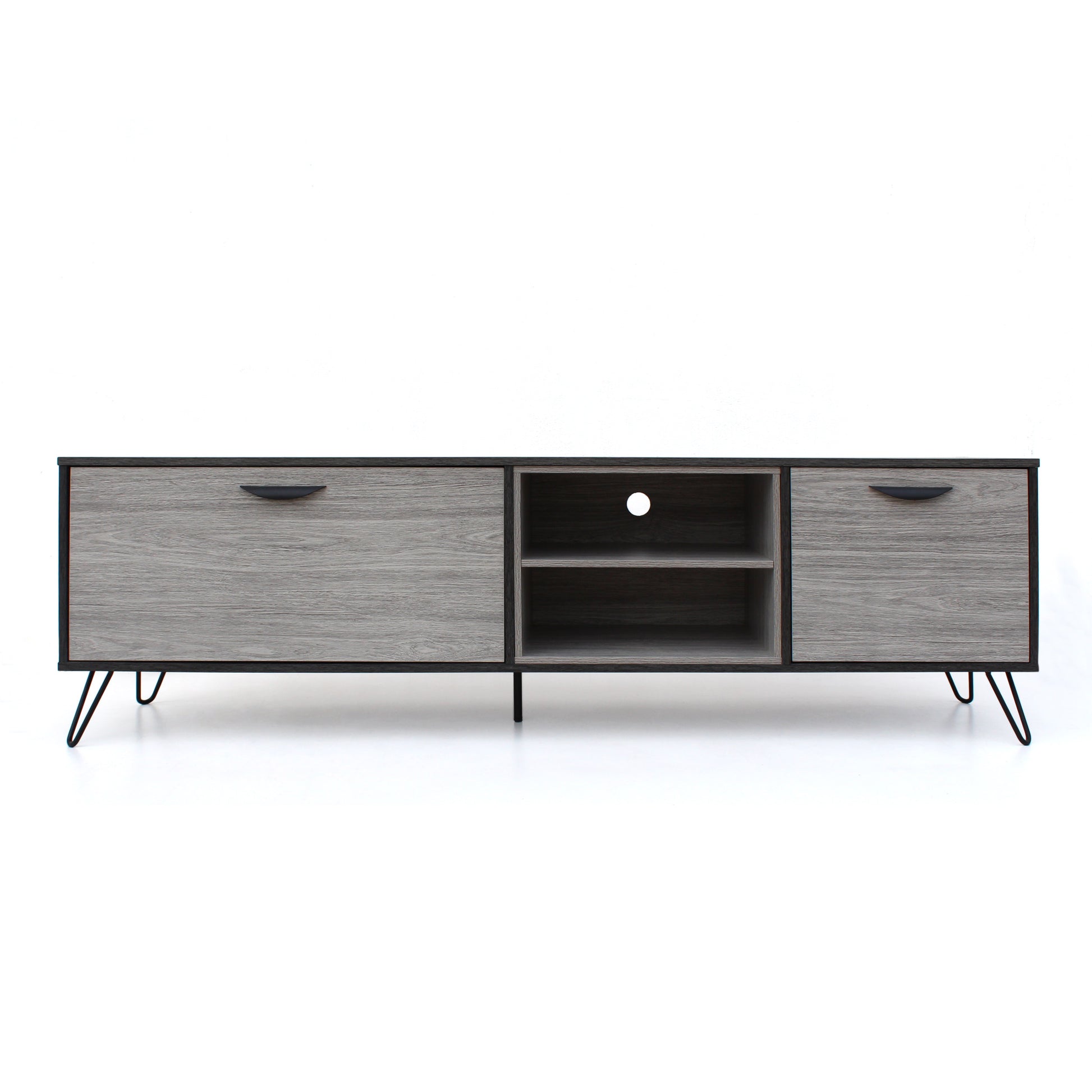 MODERN INDUSTRIAL: Our TV stand combines sleek metal accents with a wood look to craft an understated modern industrial design. Boasting beautiful hairpin legs, this accessory presents a chic aesthetic to any home.
