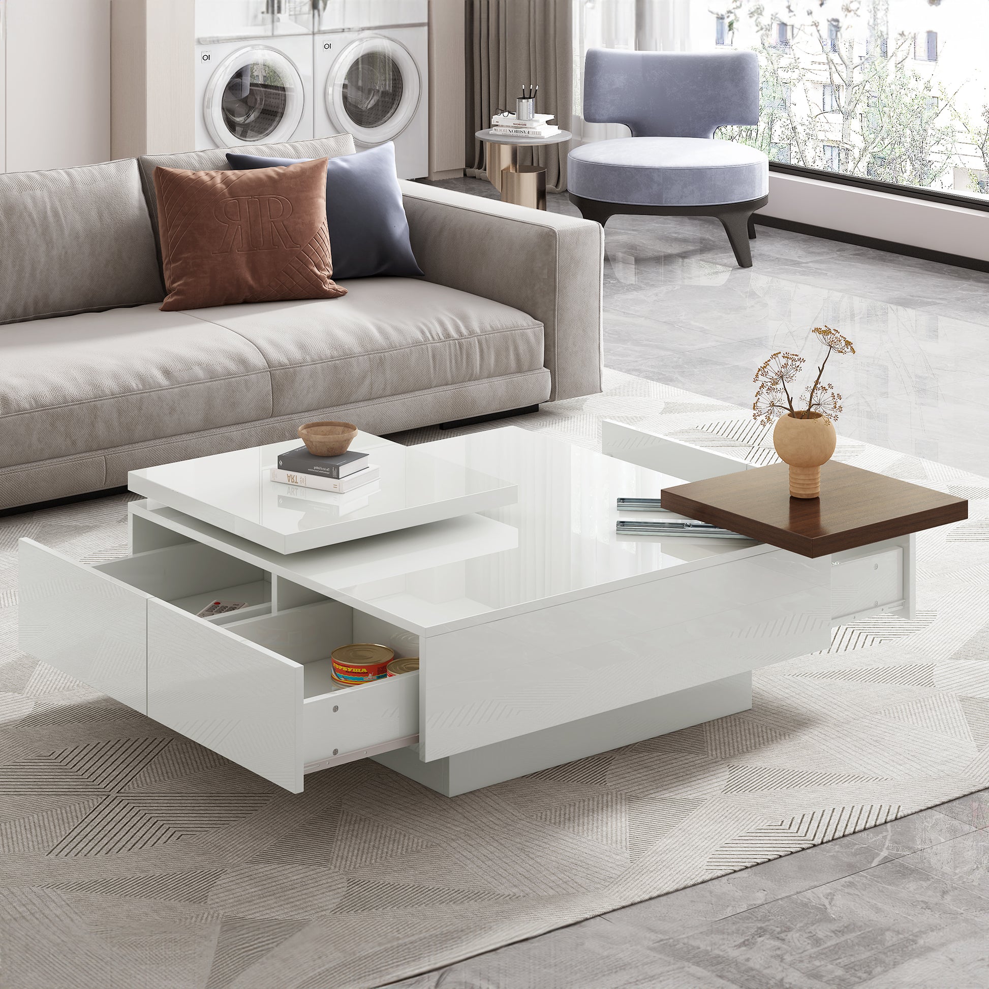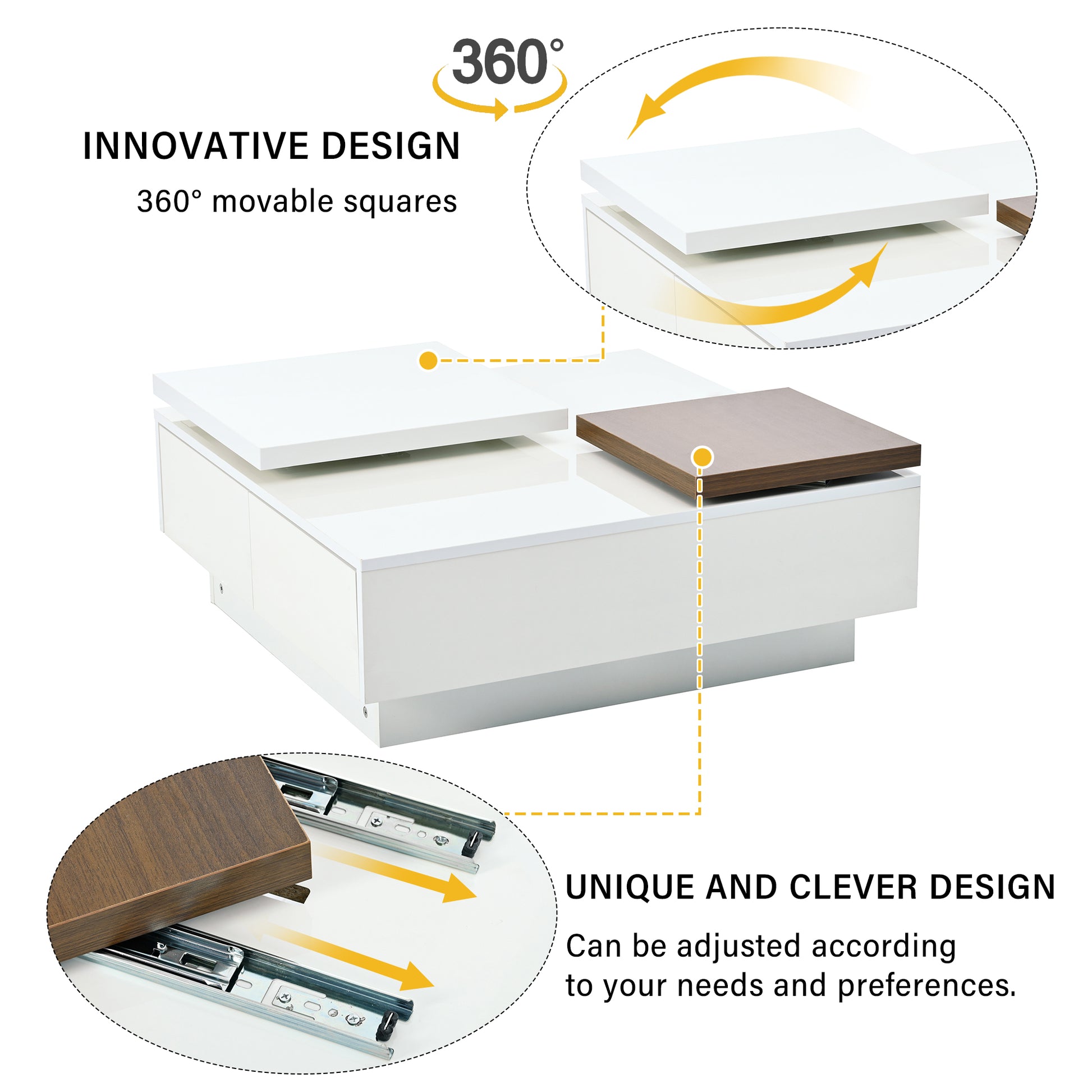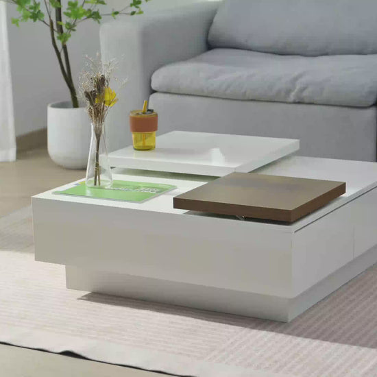 Movable Top Modern Square Wood Coffee Table with 4 Hidden Drawers