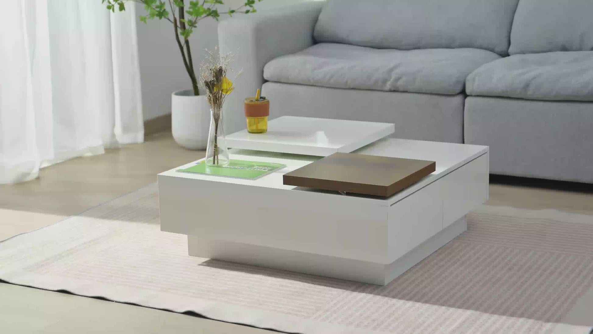 Our coffee table features two movable squares on the top, a design element that brings a new level of adaptability. These squares can be easily adjusted, allowing you to customize the table's layout to match your specific requirements. Whether you need a larger flat surface for placing snacks during a gathering or a divided space for separate activities, the flexibility is at your fingertips. This unique feature sets our coffee table apart, catering to the diverse needs of modern living.