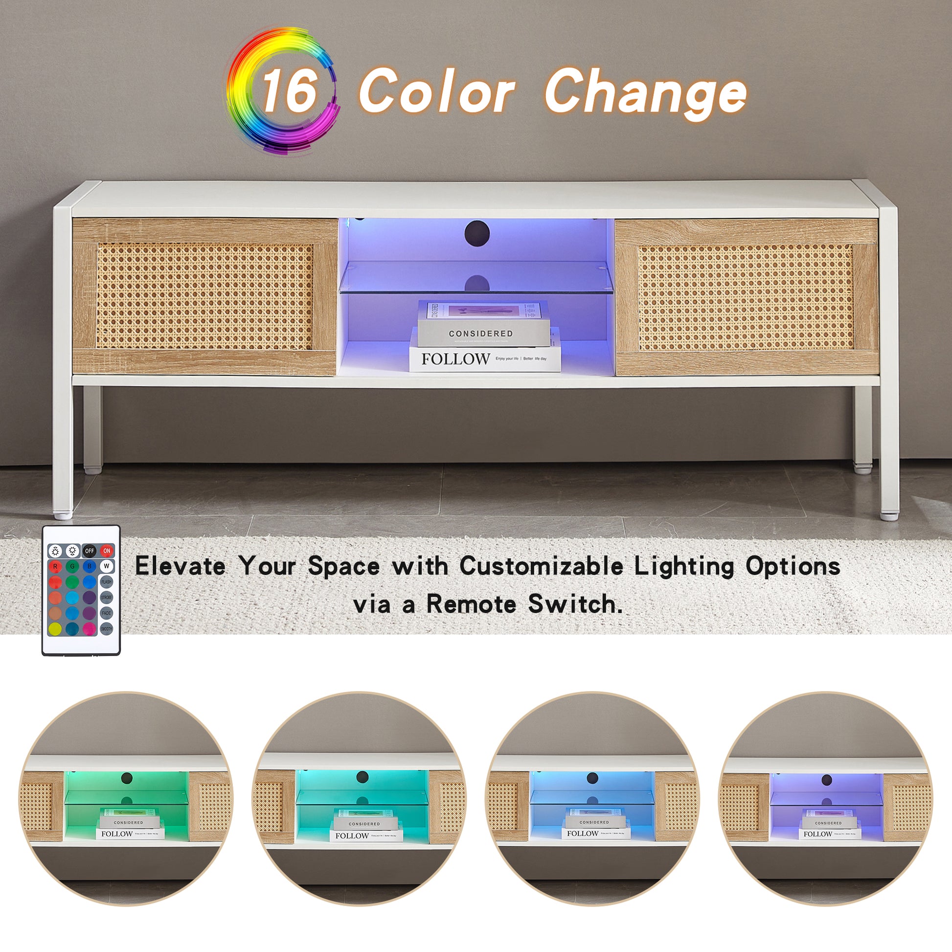 - 4.This TV cabinet has a 16 color variable light strip that can be controlled using a remote control, creating a comfortable atmosphere that immerses you and your family and friends in intoxicating lighting effects while watching movies and playing games.