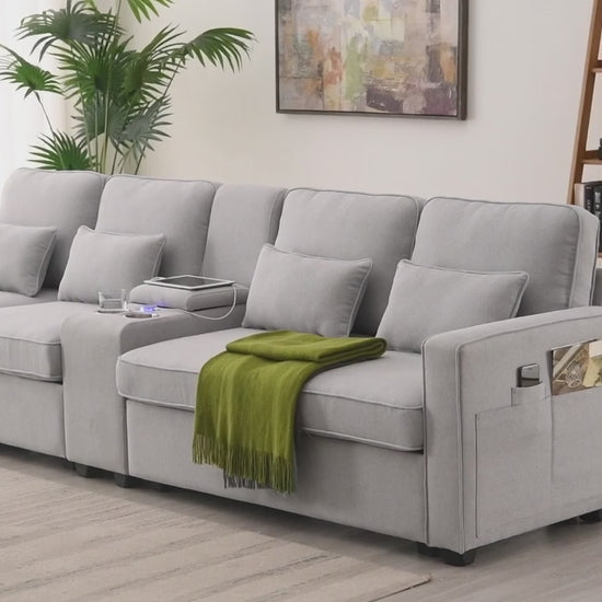 Upholstered Sofa with Console, 2 Cupholders and 2 USB Ports Wired or Wirelessly Charged, Modern Linen Fabric Couches with 4 Pillows
