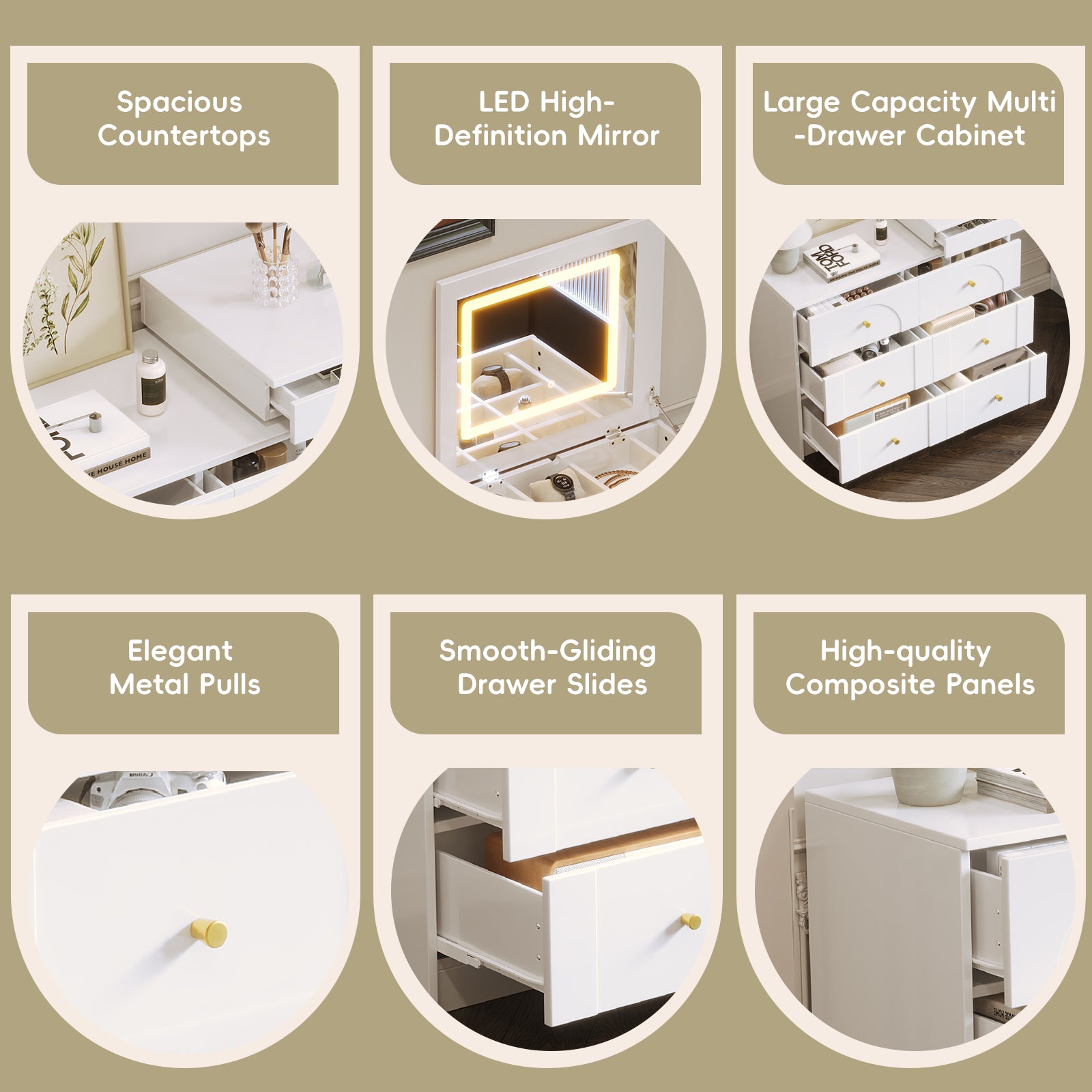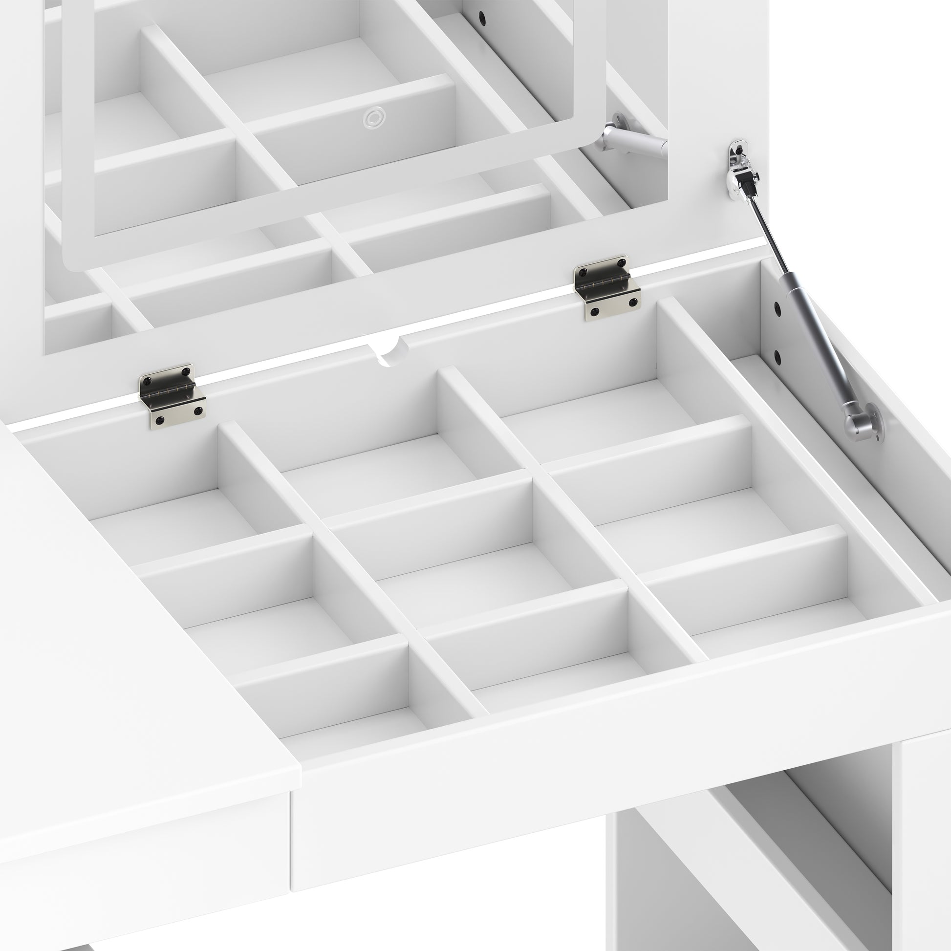 - 1.Vanity Desk with Flip-Top Tabletop: With a flip-top design on the right side, this vanity desk allows you to easily switch between beauty time and work mode. Simply open the top when you’re ready to do your makeup, and you'll find a built-in mirror along with 9 thoughtfully designed compartments to neatly organize your cosmetics and accessories. When closed, the flat surface becomes a spacious tabletop, perfect for placing daily essentials, writing, or working on your laptop.